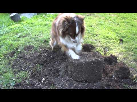 Lilah, having a smaller frame or stringier muscles, however you want to phrase it, digs using alternating paws with more of a scratching action. She works well against hard, compacted dirt or if you need to break the dense surface soil. "Dig" is also a command that she follows decently.
